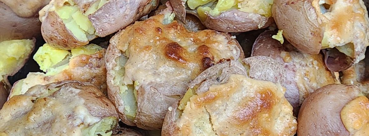 Acomodar las papas en una charola y aplastar cada una ligeramente con una taza.