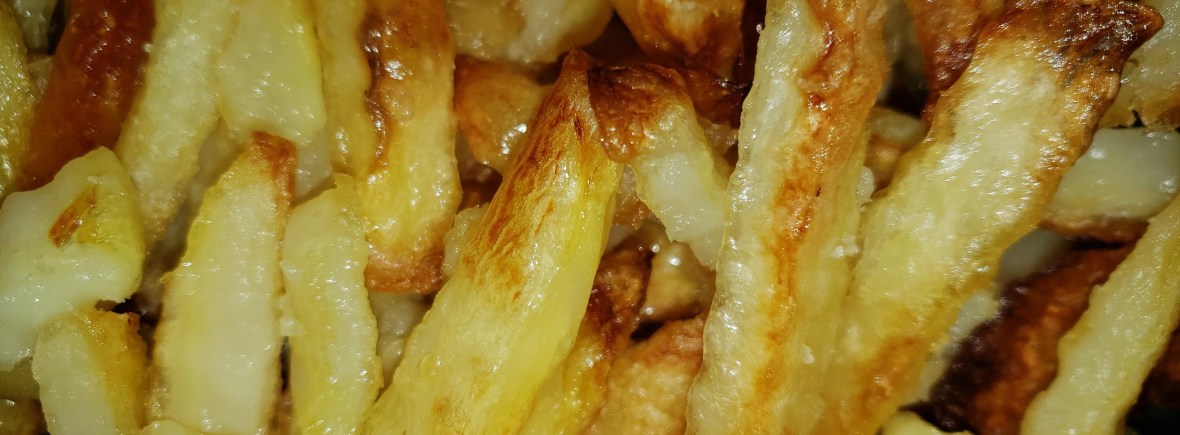 1 kg papa (lavar, pelar *opcional y cortar en bastones 5mm-10mm grosor), remojar en agua fria por 1 hora, enjuagar, escurrir.