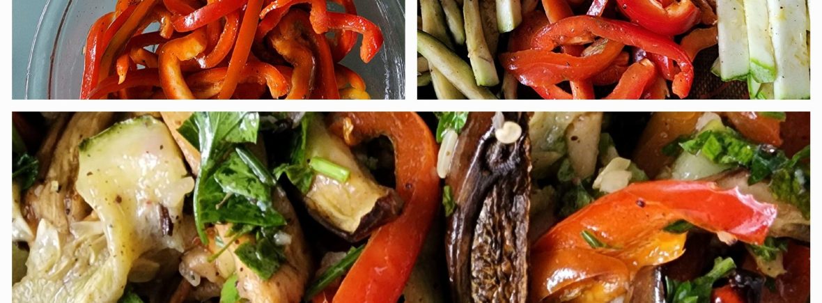 1/2kg pimiento morrón rojo (remover cáliz y semillas, lavar y rebanar en tiras de 3mm, marinar por 15 minutos en un marinado preparado de 1 cucharada de aceite de oliva extra virgen, 1/4 cucharadita pimienta negra molida y 1 cucharadita sal de mar)