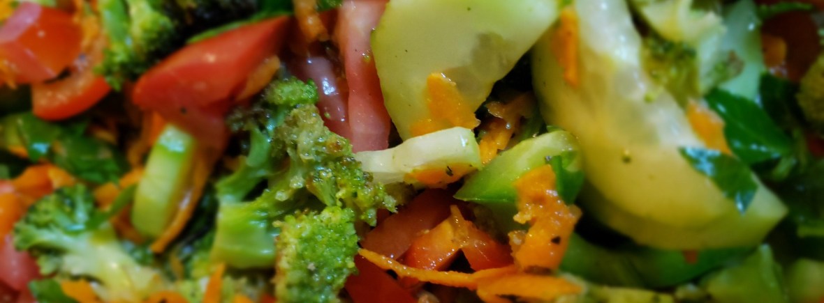 Mezclar broccoli rebanado, jitomates cortados, zanahoria pelada y rallada, pimiento morrón fileteado, perejil picado, aceite, pimienta y jugo de limón.