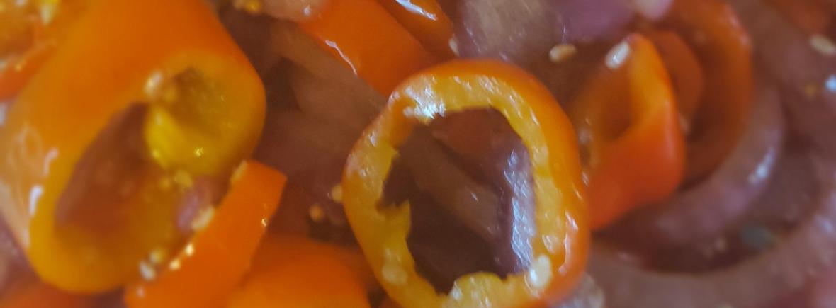 Lavar pimientos morrones, quitar semillas y rebanar finamente.