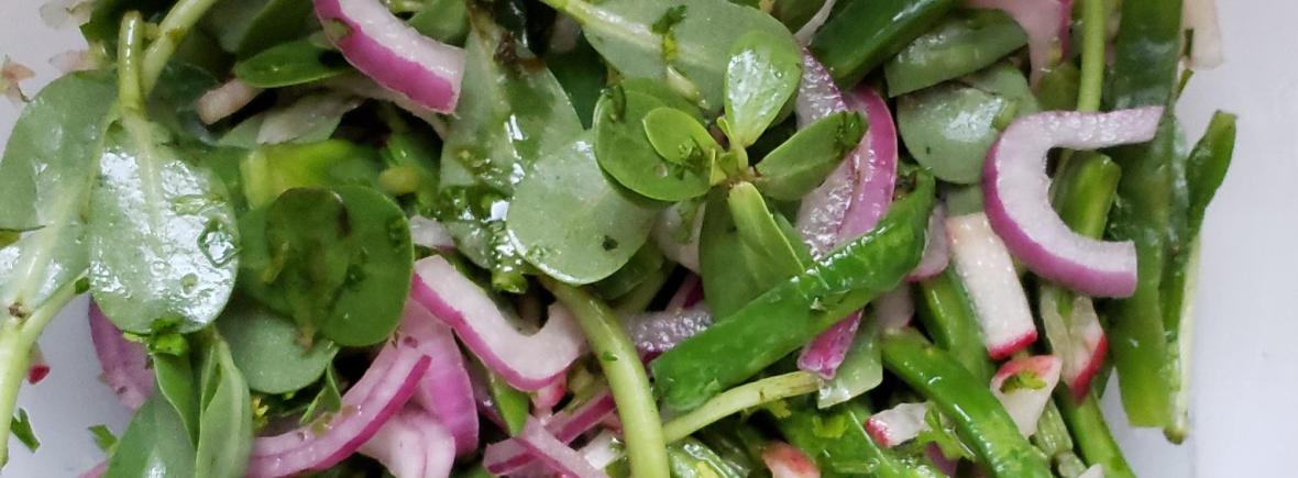 200g verdolaga (descartar partes duras, lavar, desinfectar hojas y tallo suave, rebanar)