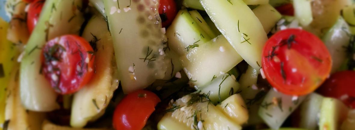 Pelar y rebanar pepino y calabacitas. Grosor al gusto.
