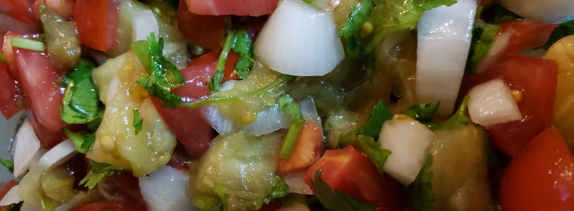 Mezclar jitomate, cebolla y perejil/cilantro picados con berenjena.
