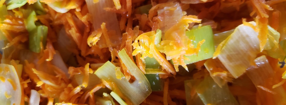 Freír poro 2 minutos, agregar zanahoria, sal, azúcar y sofreír 5 minutos a fuego medio revolviendo constantemente.