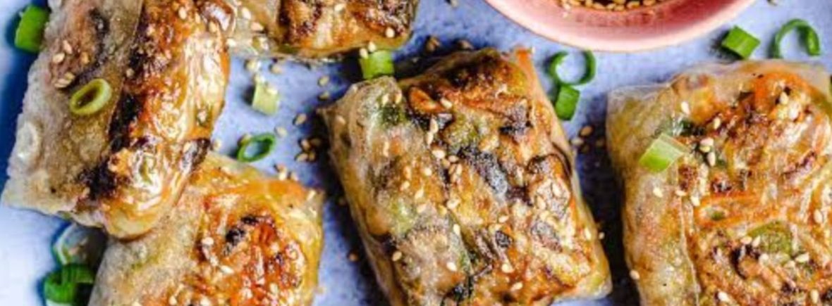 Extender en una superficie plana y, en el centro de la hoja, colocar 2 cucharadas de relleno y envolver traslapando las orillas. Colocar sobre una segunda hoja de arroz hidratada y envolver nuevamente. Evitar que los traslapes de ambas hojas queden hacia el mismo lado.