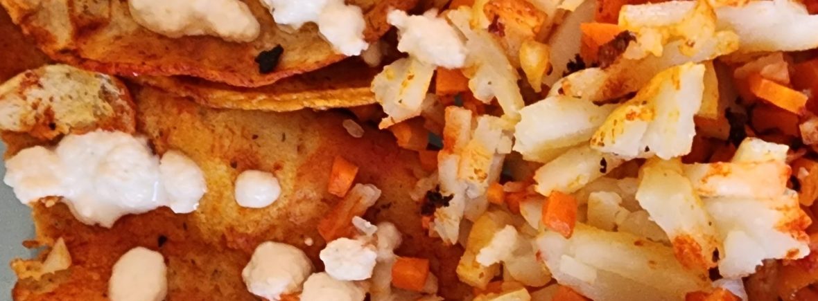 Servir las enchiladas con la guarnición de papa y zanahoria, crema de nuez de la India y aguacate.