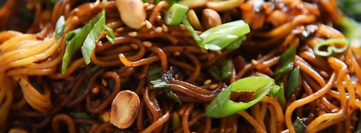 Incorporar fideos, salsa, almendras y ajonjolí.