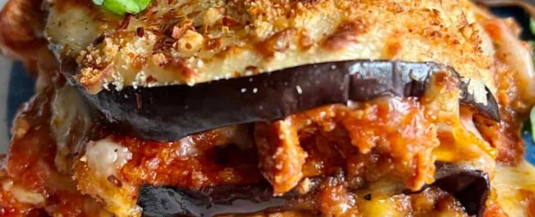 En un refractario cuadrado extender la salsa, una capa de berenjenas asadas. Esparcir queso de almendra y hojuelas de avena molidas tostadas sobre cada capa.