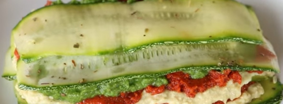 Armar la lasagna por capas. La primera de calabacitas, la segunda de queso de nuez de la india, pesto de jitomate y pesto de albahaca. Terminar con una capa de calabacitas.