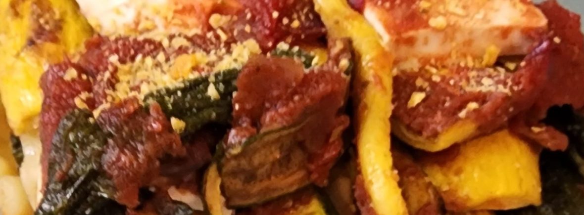 Acomodar en un refractario dos capas de las rebanadas de las calabacitas fritas, verter uniformemente 1 taza de salsa roja. Repetir las capas. Esparcir el queso de almendra sobre la ultima capa de lasagna.