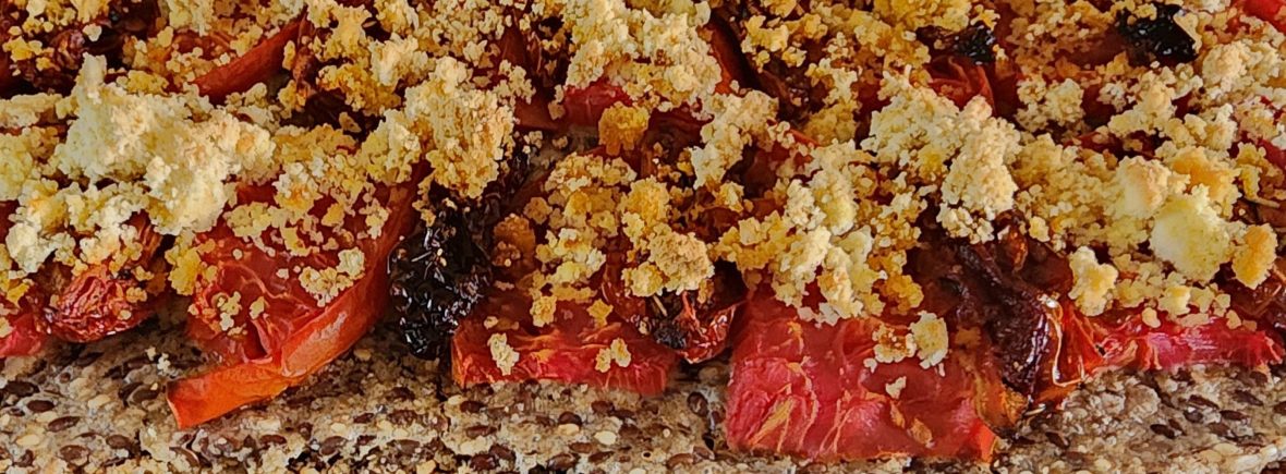 Acomodar las rebanadas de jitomate, jitomate deshidratado y esparcir queso.