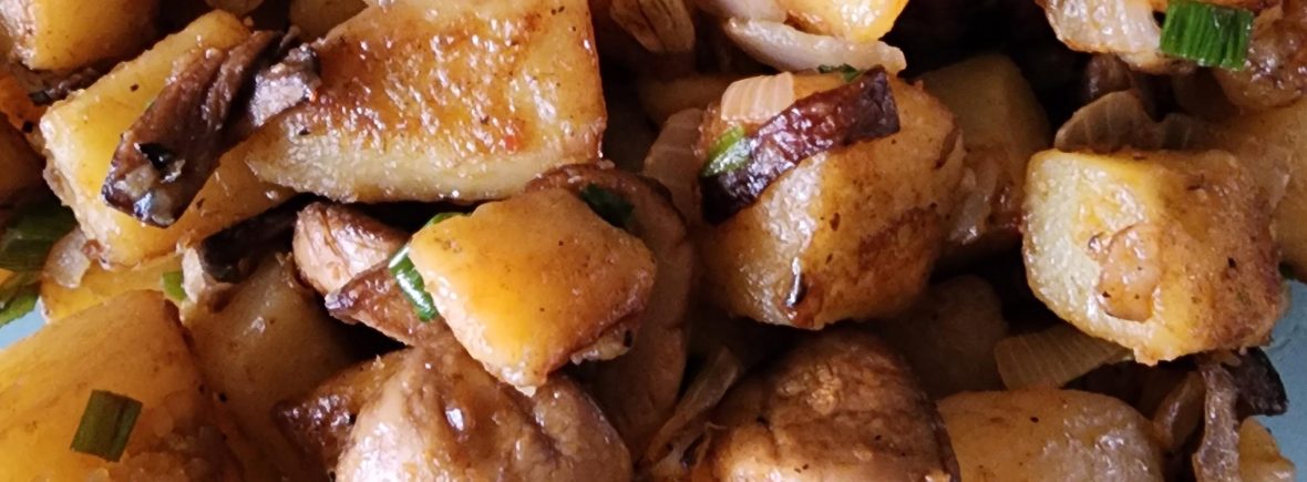 Sofreír papa y champiñón por 10 minutos a fuego alto revolviendo con regularidad.