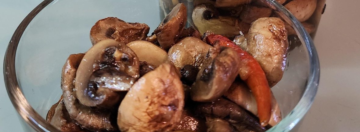 Acomodar los champiñones en un frasco de vidrio esterilizado, verter escabeche y tapar.