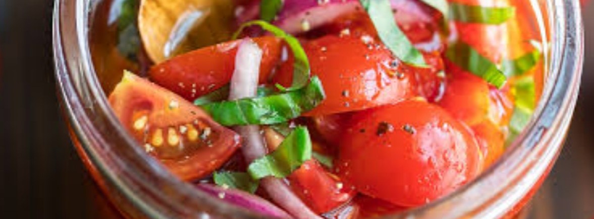 En un frasco de vidrio acomodar por capas jitomate, cebolla y ajo.