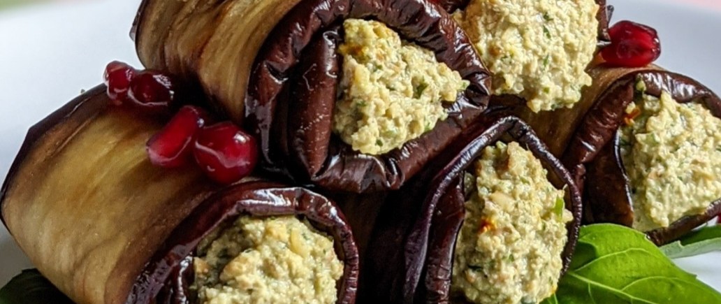 Extender una cucharadita de relleno en cada rebanada lamina de berenjena y enrollar.