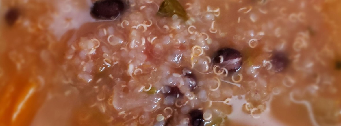 Agregar jitomate, pure o pasta de tomate, frijol cocido, quinoa, agua caliente, revolver y cocer la sopa por 25 minutos a fuego bajo en una cazuela tapada.