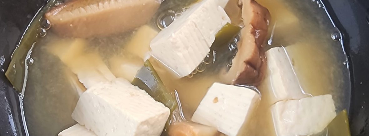 Cocer shitake y Kombu por 15 minutos en agua en una olla tapada.
